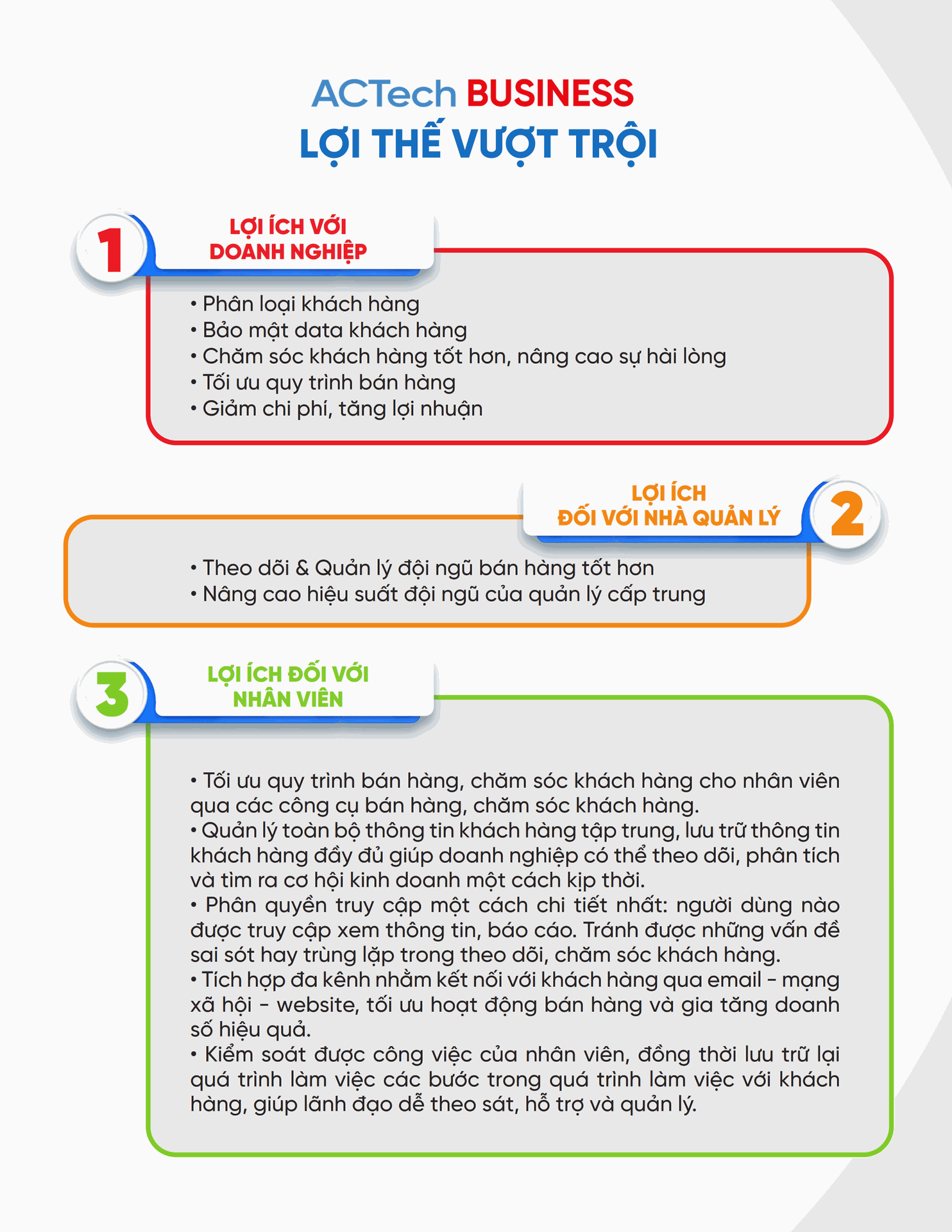 ACTech BUSINESS tối ưu nguồn nhân lực kinh doanh trong việc quản lí hiệu quả tiến trình chăm sóc khách hàng. Kiểm soát quy trình bán hàng giúp doanh nghiệp bám đuổi mục tiêu kinh doanh & chăm sóc khách hàng realtime